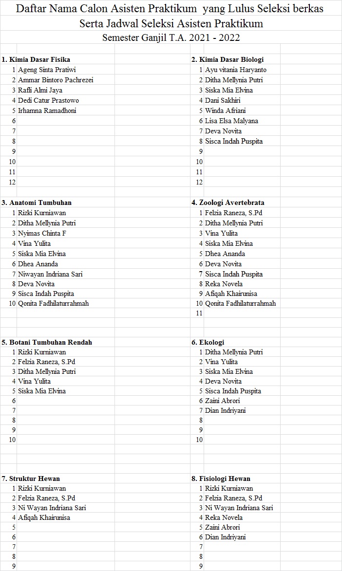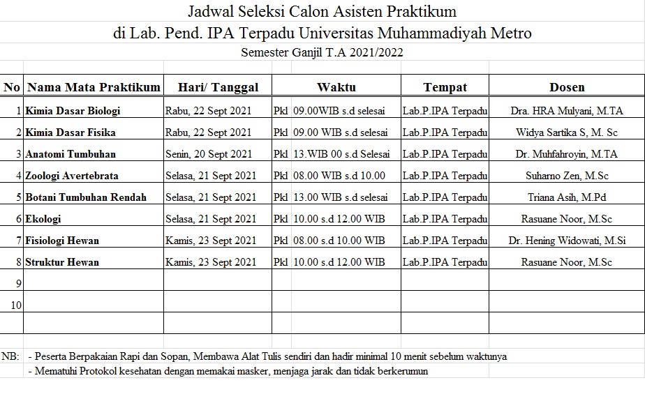 Jadwal Selesksi Calon Asisten Praktikum di Lab P. IPA Terpadu UM Metro, Smt Ganjil 2021 -2022