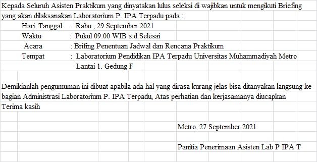 PENGUMUMAN ASISTEN TERPILIH SEMESTER GANJIL T.A 2021 - 2022